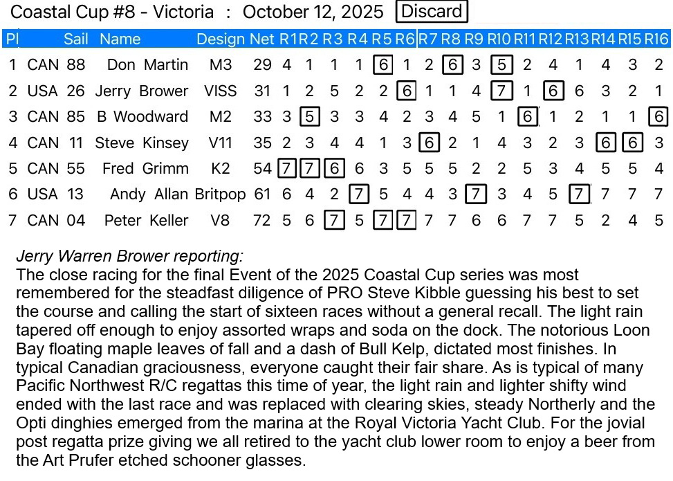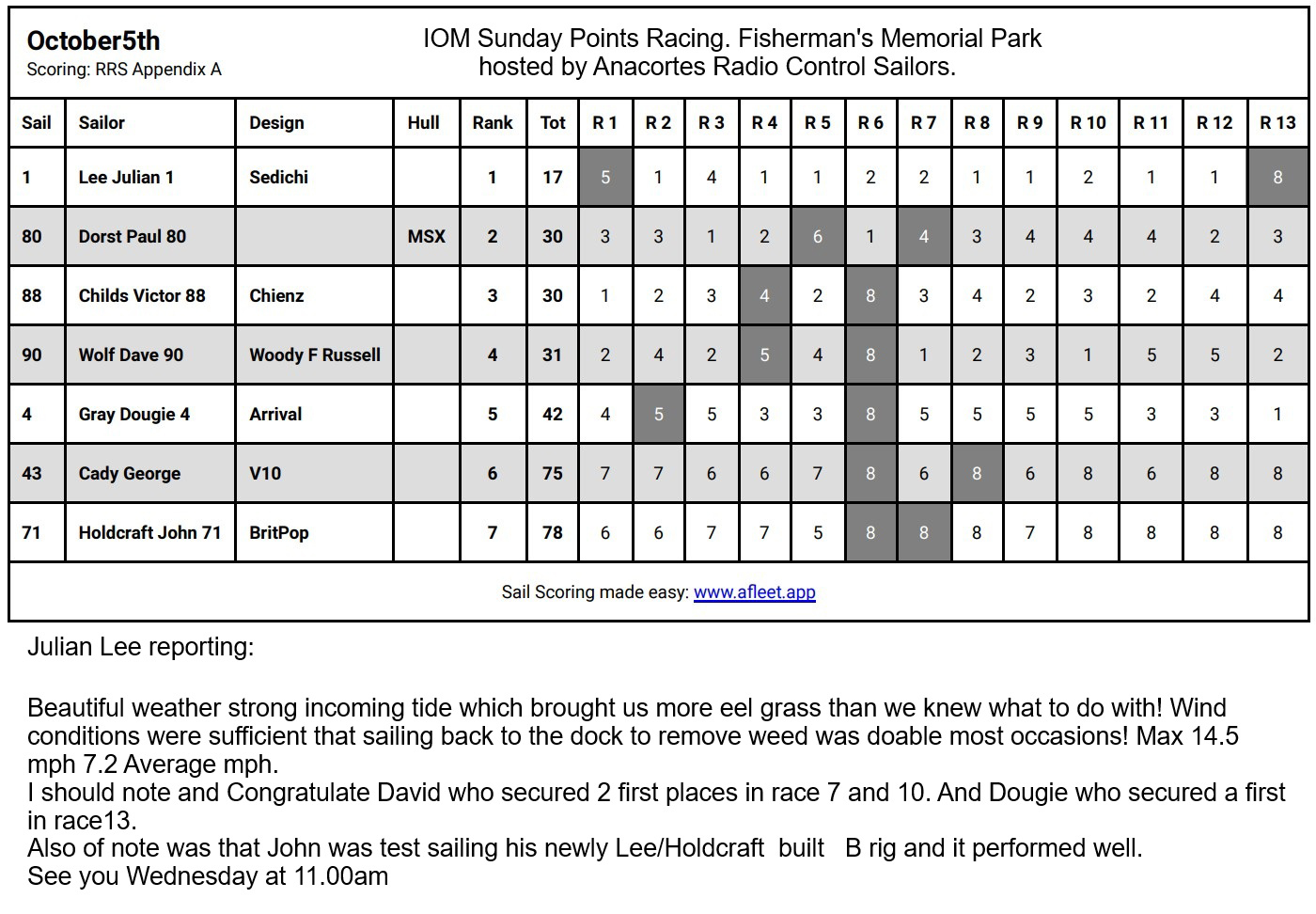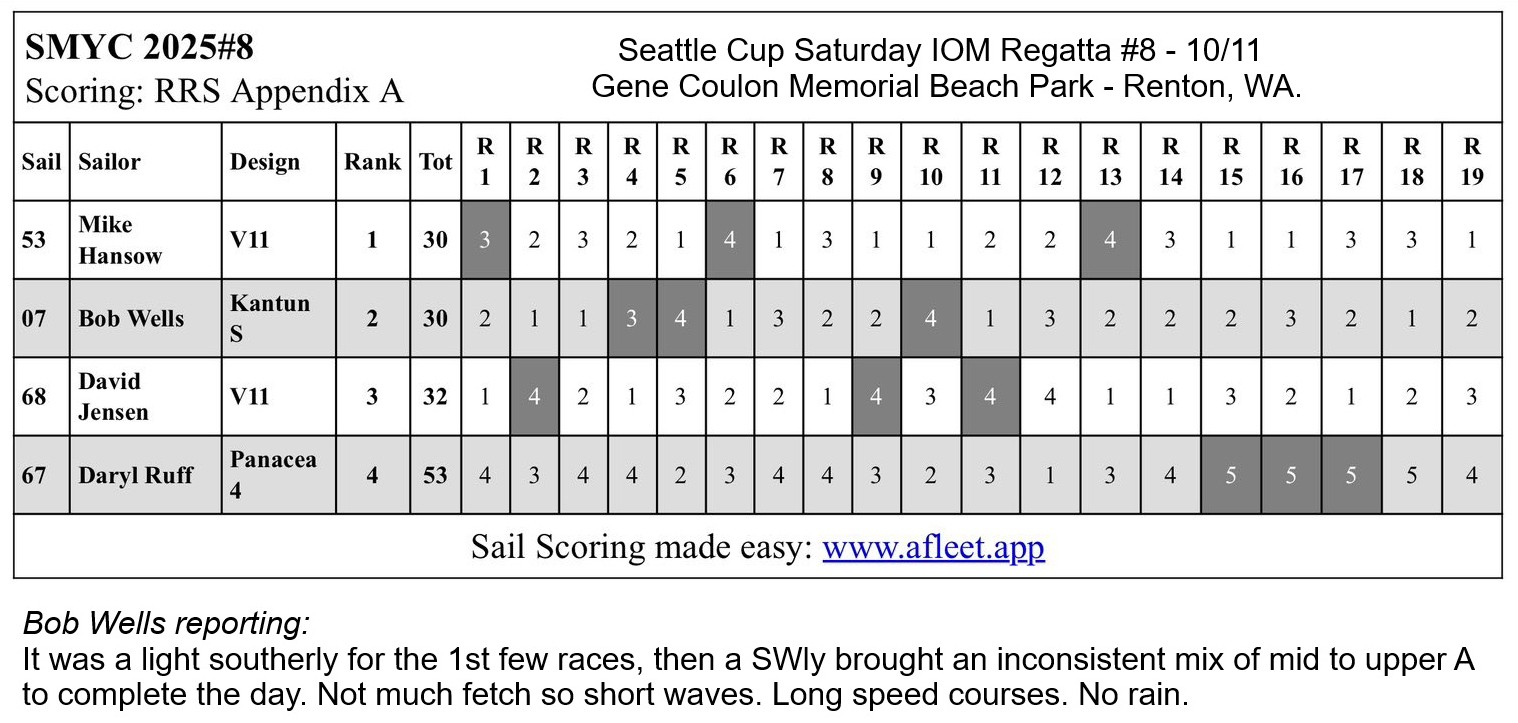 Upcoming 2025 IOM and DF95 Events:<< Long Lake IOM Every Friday (or Sat weather dependent) Loudon Park, Nanaimo, BC. 9:!5-2PM. See FB BC pg. Stan.>><< Anacortes RCS IOM 11AM Sunday and Wednesday LowKey . *Best with plus tide* Seafarers Park. Julian L>> << Steveston RC, IOM, 11AM-1PM Second and 4th Sunday. Results Imperial Landing, Richmond, BC. Allan G. Olympia Model Sailors 1st and 3th Sunday DF95 10AM start Swantown or Port Plaza. (Wind direction). See FB pg. >> ------------------------------Coming-up in the next 30 days.10/19 Anacortes RCS IOM Sunday 11AM-3PM Seafarers Park, tide good Julian L. 10/19 Olympia Model Sailors DF95 #92 10AM Swantown See FB pg. Canceled.10/21 10-noon Lake Whatcom DF95 casual sailing Sudden Valley Marina, Bellingham, WA. no scores. d 10/22 Anacortes RCS IOM Wednesday LowKey 11AM-2PM. GbMajor. Seafarers Park, tide good Julian L. 10/24 Long Lake IOM Friday Loudon Park, Nanaimo, BC. 9:15-2PM. See FB BC pg. Stan S. 10/25 GHMYC DF95 Fall Racing series Saturday Regatta #1. Coulon Park, Renton, WA. Daryl R. See FB pg. .10/26 Anacortes RCS IOM Sunday 11AM-3PM Seafarers Park, tide good Julian L. 10/26 11AM IOM Steveston RC Fall #4 Imperial Landing, Richmond, BC. Allan G .(604)721-5504.10/28 10-noon Lake Whatcom DF95 casual sailing Sudden Valley Marina, Bellingham, WA. no scores. 10/29 Anacortes RCS IOM Wednesday LowKey 11AM-2PM. GbMajor. Seafarers Park, tide good Julian L. 10/31 Long Lake IOM Friday Loudon Park, Nanaimo, BC. 9:15-2PM. See FB BC pg. Stan S. 11/02 Anacortes RCS Anacortes RCS IOM Sunday 11AM-3PM Seafarers Park, tide good Julian L. 11/02 Olympia Model Sailors DF95 10AM DF95 #93 Swantown or Port Plaza. (Wind direction). See FB pg.11/05 Anacortes RCS IOM Wednesday LowKey 11AM-2PM. GbMajor. Seafarers Park, tide good Julian L. 11/07 Long Lake IOM Friday Loudon Park, Nanaimo, BC. 9:15-2PM. See FB BC pg. Stan S. 11/08 10AM-2PMGHMYC DF95 Fall Racing series Saturday Regatta #2. Coulon Park, Renton, WA. Daryl R. See FB pg. 11/09 Anacortes RCS Anacortes RCS IOM Sunday 11AM-3PM Seafarers Park, tide good Julian L. 11/09 11AM IOM Steveston RC Fall Final Imperial Landing, Richmond, BC. Allan G .(604)721-550411/12 Anacortes RCS IOM Wednesday LowKey 11AM-2PM. GbMajor. Seafarers Park, tide good Julian L. 11/14 Long Lake IOM Friday Loudon Park, Nanaimo, BC. 9:15-2PM. See FB BC pg. Stan S. 11/15 10AM-2PM GHMYC DF95 Fall Racing series Saturday Regatta #3. Coulon Park, Renton, WA. Daryl R. See FB pg. What's NEW! Recent site Updates10/18 Added Wells Report for IOM, AMYA R6 Championship. Coulon Park, Renton. See 2025 09/27. 10/16 Posted 2025 WCRS Coastal Cup Series season ReCap by Steve Kinsey. See 2025 10/12. 10/14 Posted Seattle MYC IOM Regatta #8 scores and season pts. See 2025 10/11. 10/14 posted WCRS Coastal Cup #8 scores, photos and season pts. See 2025 10/12. 10/10 Added DF95 AMYA US Nationals Sailing Instructions Measurement Info. See 2025 10/16. 10/06 Posted Anacortes RCS IOM Sunday Results from Cap Sante Lagoon. See 2025 10/04. 10/04 Posted GHMYC IOM Saturday Regatta #8 Results from Surprise Lake. See 2025 10/04. 10/03 Posted Long Lake IOM Friday Results from Loudon Park, Nanaimo. See 2025 10/03. 10/01 Added AMYA R6 Championship Video link from Coulon Park. See 2025 09/27. 09/29 Posted Anacortes RCS IOM Sunday Report from Seafarers Park. See 2025 09/28. 09/28 Posted IOM, AMYA R6 Championship Results from Coulon Park. See 2025 09/26. 09/28 Posted Long Lake IOM Friday Results from Nanaimo. See 2025 09/26. 09/23 Posted IOM WCRS Coastal Cup Royal Vic Fanale SI and OLR. See 2025 10/12. 09/22 Included Don Martin Report from Saltspring IS for Canadian Nationals. See 2025 09/11. 09/21 Posted Anacortes RCS IOM Sunday Results from Seafarers Park. See 2025 09/21. 09/21 Posted Olympia Model Sailors DF95 #90 Report from Swantown. See 2025 09/21. 09/20 Posted Gig Harbor Cup #7 Results from Surprise Lake. See 2025 09/20. 09/20 Posted Long Lake IOM Results and Summer Series from Loudon Park. See 2025 09/19. 09/16 Posted Caanadian IOM Nationals Results and Report. See 2025 09/12. 09/08 Posted Olympia Model Sailors DF95 #89 Report from Swantown Marina. See 2025 09/07. 09/06 Posted Seattle MYC IOM Saturday Regatta #7 scores from Coulon Park. See 2025 09/06. 09/05 Posted Long Lake IOM Friday Results from Loudon Park, Nanaimo. See 2025 09/05. 09/02 Added Anacortes RCS Sunday scores and Wells' DF95 wrap-up. See 2025 Header and 08/31. 09/01 Posted scores from Long Lake, Coulon and Dan's Report from Olympia. See 2025 08/29. 08/25 Added Don Martin Report from 8/16 Squamish Event. See 2025 08/16. 08/24 Posted Bob Wells report for Dan's DF95 Travelers Trophy at Coulon Park. See 2025 08/23. 08/23 Posted Dan's DF95 Travelers Trophy #3 Results from Coulon Park. See 2025 08/23. 08/23 Posted Long Lake Sailors Summer Wk #8 Results From Loudon Park. See 2025 08/22. 08/20 Julian L reports Anacortes RCS 8/24 Sunday IOM Start delayed until 1PM. See 2025 08/24. 08/18 Updated Anacortes SOM to include Vic Childs as August 2025 Sailor of the Month. 08/18 Anacortes LowKey Wednesday Start delayed until NOON-3PM for Water. See 2025 08/20. 08/18 Posted Anacortes RCS Sunday Results from Seafarers Park. See 2025 08/17. 08/17 Posted Olympia Model Sailors DF95 #88 Swantown Results. See 2025 08/17. 08/16 Posted Coastal Cup #6 Results from MamQuam Channel Squamish, BC. See 2025 08/16. 08/14 Added Bob Wells reports for GH#5 with SC#5 and GH#6 with SC#6. See 2025 07/12 and 08/02. 08/13 Long Lake IOM Friday 08/15 at Loudon Park, Nanaimo. Canceled. See FB BC pg. Stan S. 08/09 Posted Seattle MYC #6 Results from Coulon Park. See 2025 08/09. 08/05 Added Anacortes RC Sailors scores from July 20 and August 3. See 2025 07/30 and 08/03. 08/05 Posted OnLine Registration and Sailing Instructions for Squamish Coastal Cup #6. See 2025 08/16. 08/03 Posts results from Long Lake, Surprise Lk and Olympia. See 2025 08/01 07/28 Added Coastal Cup #5 Report from Long Lake. See 2025 07/19 07/26 Posted GHMYC DF95 Saturday Regatta #6 Results 
